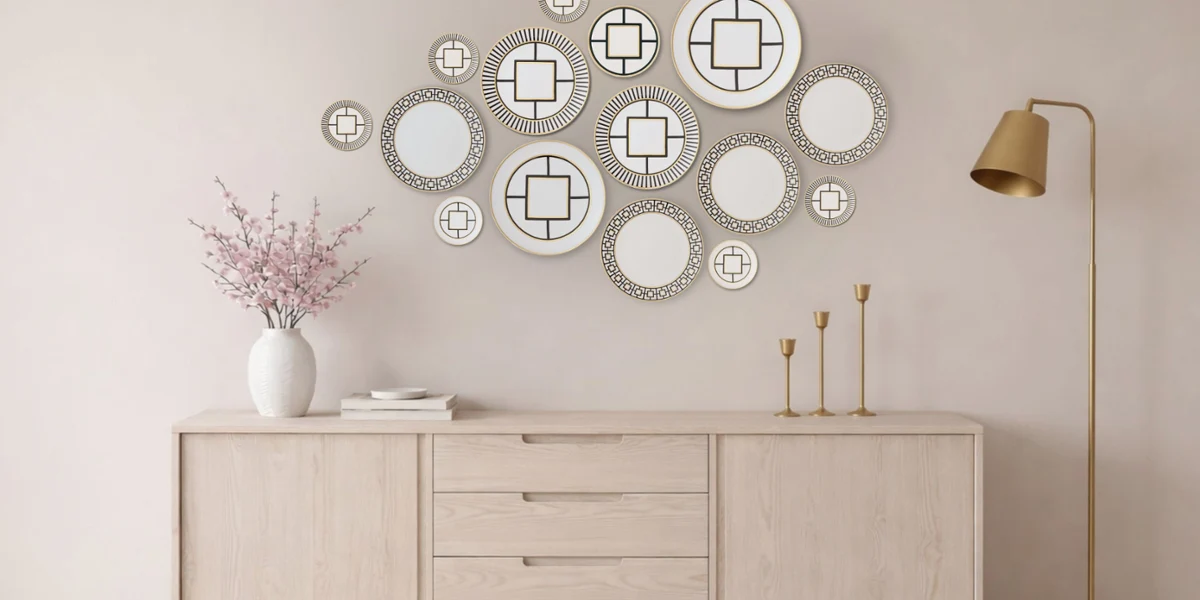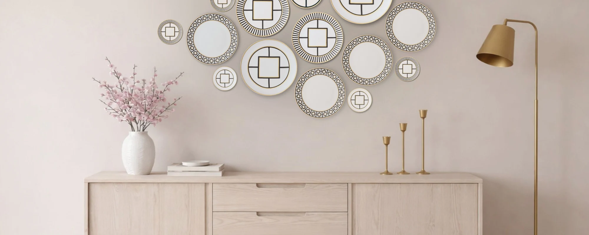 Defined by bold geometric patterns and striking contrast, this collection proves that decorative plate walls can feel contemporary and sophisticated—not just vintage-inspired.