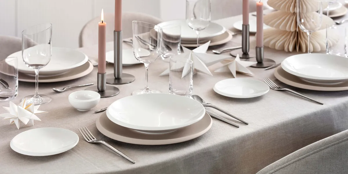 Preparations for a modern Christmas are in full swing. The table is designed in a minimalist and stylish way, with simple, contemporary elements. Neutral tones such as white, black, and beige dominate, complemented by subtle color accents. Geometric candleholders and elegant, clear glasses add modern accents, while subtle details such as elegant napkin rings give the table a sophisticated touch. This decoration combines contemporary style with a festive atmosphere and creates an unforgettable experience. Moments are captured together, modern traditions are cultivated, and the joy of being together is celebrated, making for a stylish and memorable Christmas.