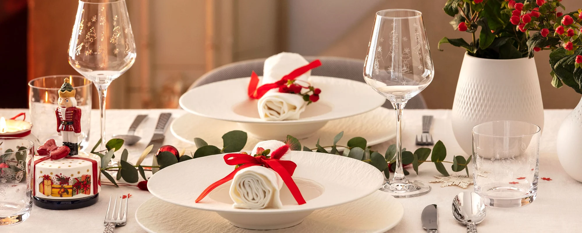 You will find numerous elements for your Christmas table decorations in the Villeroy & Boch range. From decorative Christmas figurines, hurricane lamps, and candleholders, to Christmas vases for fir branches and poinsettias, there are numerous options available to you. Christmas table decorations can be both lavish and playful.